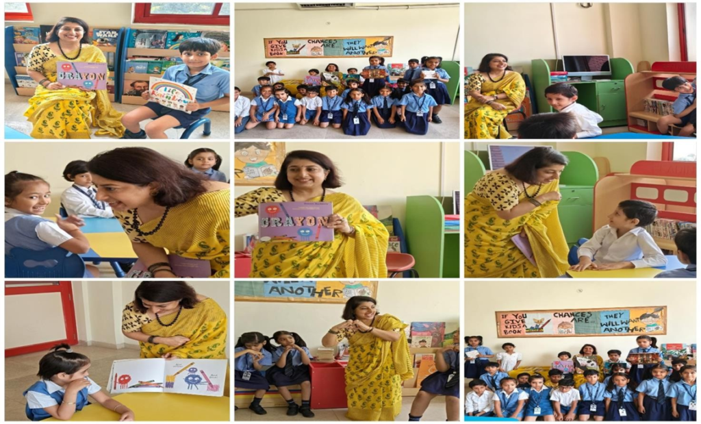 - Storytelling Session: The HM narrated the story “Crayon” by Simon Rickerty, capturing students’ interest and imagination.